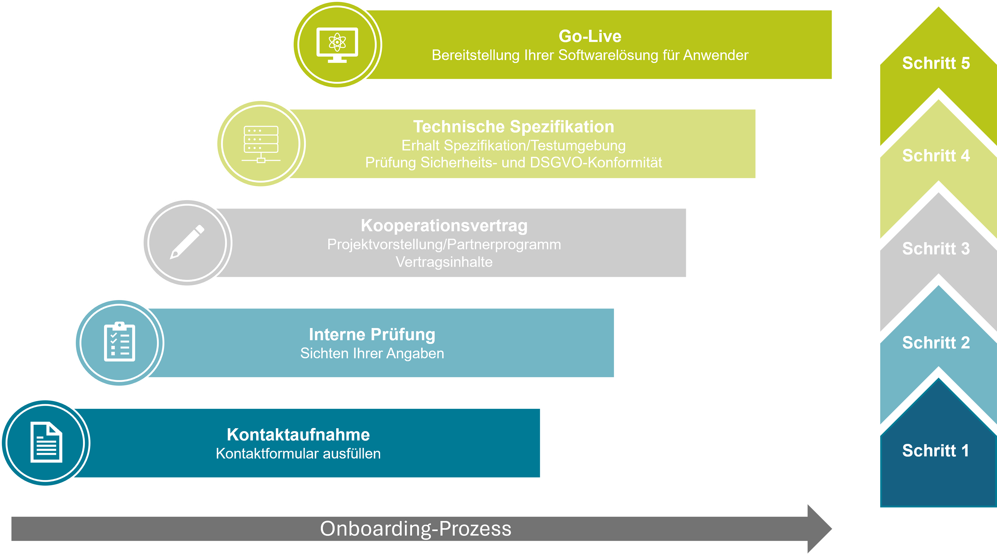 Werden Sie Teil unseres Ökosystems und binden Sie Ihre Softwarelösung schnell und sicher an unsere Praxissoftwarelösungen an. Unser strukturierter Onboarding-Prozess begleitet Sie von der ersten Kontaktaufnahme bis zum Live-Betrieb.